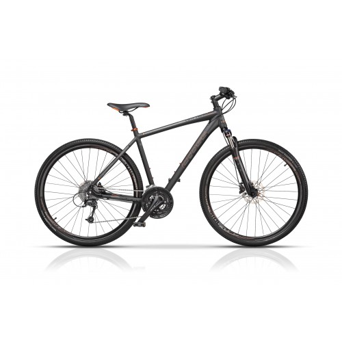 Bicicleta de tip cross cu echipare de top Shimano,frane hidaulice pe disc, furca cu suspensie blocabila si 27 de viteze.